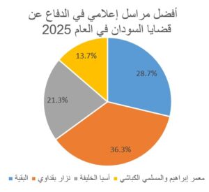 2/على مستوى أبرز صحفي في الدفاع عن قضايا السودان، تصدّر المشهد عادل الباز بحصوله على نسبة 25.7% من آراء المشاركين، في مؤشر على ثقة ملحوظة في طرحه وتحليلاته السياسية. وجاء بعده كل من عبد الرؤوف طه، ضياء الدين بلال،محمد جمعه نوار والهندي عز الدين بنسبة متقاربة جدا بلغت 23,4%، و23.3% بينما حلّ محمد جمعه نوار واحمد حمد الترابي ثالثًا بنسبة 16.3%. وتوزعت بقية الأصوات على أسماء أخرى بنسبة محدودة، بما يعكس تشتتًا نسبيًا خارج المراكز الأولى.