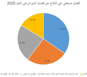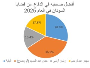 2/وفي فئة أبرز صحفية في الدفاع عن قضايا السودان، جاءت حنان عبد الحميد أم وضاح في الصدارة بنسبة 36.9%، متقدمة بفارق واضح، تلتها سهير عبد الرحيم بنسبة 18.7%، ثم رشان أوشي بنسبة 16.4%. أما بقية الأصوات، التي بلغت 28%، فقد توزعت على عدد من الأسماء البارزة، من بينها سلمى عبد العزيز، ويسرا الباقر، وزينب محمد صالح، وشمائل النور، وسارة تاج السر وعائشة الماجدي.
