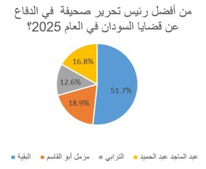 1/ عبرت نتائج الاستطلاع عند السؤال حول أبرز رئيس تحرير في الدفاع عن قضايا السودان خلال العام 2025 عن تباين لافت في اتجاهات الرأي العام، يعكس تعدد المدارس الصحفية وتنوّع زوايا التلقي في مشهد إعلامي شديد التعقيد. فقد تصدّر د. مزمل أبو القاسم النتائج بحصوله على 18.9% من إجمالي آراء المشاركين، وجاء في المرتبة الثانية عبد الماجد عبد الحميد بنسبة 16.8%، بما يعكس تأثير خطه التحريري وتفاعله المستمر مع تطورات الشأن العام، فيما حلّ عادل الباز ثالثًا بنسبة 12.6%، محافظًا على موقعه كأحد الأصوات التحليلية التي ما زالت تحظى بثقة قطاع معتبر من الجمهور.وفي المقابل، أظهرت النتائج أن أكثر من نصف الأصوات، بنسبة 51.3%، توزعت على قائمة واسعة من رؤساء التحرير والصحفيين، في مقدمتهم عثمان ميرغني عبود عبد الرحيم، أحمدي ،الطاهر ساتي، وحيدر المكاشفي، وسامي عبد الله، وإدريس الدومة ويوسف التاي ،وصلاح الدين عووضة، وهيثم محمود، وهو ما يعكس اتساع دائرة التأثير الإعلامي وعدم انحصار الثقة في أسماء محددة.