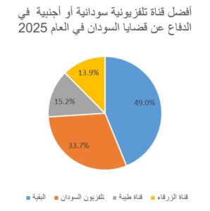 6/ وعلى صعيد أبرز قناة تلفزيونية، تصدّر تلفزيون السودان بنسبة 21.9%، تليه قناة طيبة بنسبة 15.2%، ثم قناة الزرقاء بنسبة 13.9%، فيما نالت بقية القنوات، مثل فضائية الخرطوم والعربية، نسبة 49%.