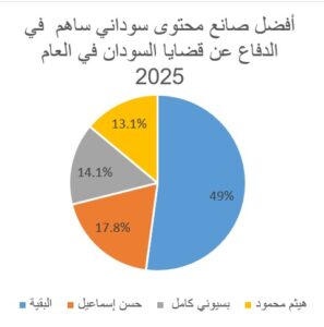7/أما أبرز صانع محتوى، فقد جاء حسن إسماعيل في المقدمة بنسبة 17.8%، يليه بسيوني كامل بنسبة 14.1%، ثم هيثم محمود بنسبة 13.1%، بينما ذهبت نسبة 49% إلى أسماء متعددة، من بينها ود المصطفى، وعلاء الدين محمد عثمان، وعثمان ذو النون، وعبد المنعم الربيع وأحمد الضي.