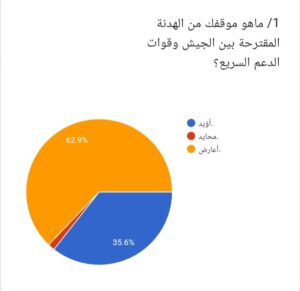 1/ عند سؤال المشاركين في مفتتح الاستطلاع عن موقفهم من الهدنة المقترحة بين الجيش وقوات الدعم السريع.. جاءت الإجابات واضحة وقاطعة؛ إذ قالت غالبية المشاركين بنسبة 62.9% أن الهدنة ليست الخيار المناسب في هذه المرحلة، معلنين رفضهم لها بشكل حاسم…بينما أيّدها 35.6% فقط، وظهرت نسبة صغيرة محايدة بلغت 1.5%، في مؤشر صريح على أن شارعًا واسعًا يرى أن الهدنة قد لا تحقق مصلحة البلاد في ظل الظروف الحالية.