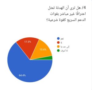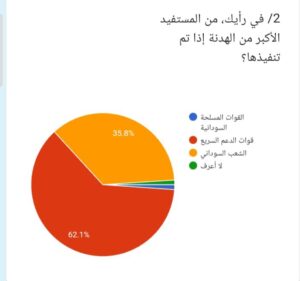 4/ وعندما طُرح عليهم سؤال: هل تمثل الهدنة اعترافًا غير مباشر بقوات الدعم السريع؟ جاءت الإجابة صريحة؛ حيث رأى 64.4% من المشاركين أن الهدنة بالفعل تحمل اعترافًا غير مباشر…في حين ورفض 17.3% ذلك، بينما قالت نسبة 15.4% إنها تمثل اعترافًا إلى حد ما.. .أما نسبة 2.9% فقالت انها لا تعرف…هذه الأرقام تفسّر ارتفاع حساسية الشارع تجاه أي ترتيبات دولية قد تعطي دعماً سياسياً لقوات الدعم السريع