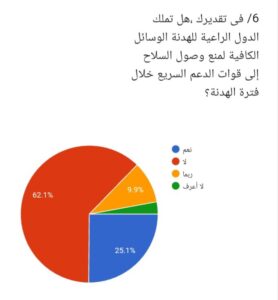 6/ وعندما وُجّه إلي المشاركين سؤالاً حول قدرة الدول الراعية على منع وصول السلاح لقوات الدعم السريع أثناء الهدنة..أجاب نسبة 62.1% من المشاركين بأن تلك الدول لا تمتلك القدرة على ضبط تدفق السلاح، وهو تقدير يعكس انعدام الثقة في أي رقابة دولية.