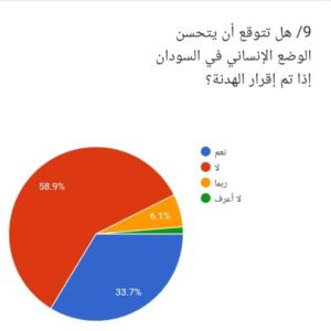 9/ وعند سؤال المشاركين عن توقعاتهم عن تحسّن الوضع الإنساني في حال إقرار الهدنة أوضح 58.9% من المشاركين أنهم لا يتوقعون أي تحسّن، ما يعكس تشاؤمًا عميقًا تجاه القدرة الفعلية للهدنة على وقف معاناة المدنيين.وفي المقابل، تتفءل نسبة 33.7% أن الأوضاع قد تتحسن بالفعل، بينما قال 6.1% ربما، وظهرت نسبة 1.3% قالت إنها لا تعرف.