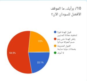 10/ وعندما طُلب من المشاركين تحديد الموقف الأفضل للسودان الآن.. اتجهت غالبية المشاركين بنسبة 54.5% نحو خيار رفض الهدنة حتى يتم الحسم الميداني، بينما فضّل 22.1% القبول الفوري تخفيفًا لمعاناة المدنيين.