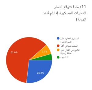 11/ وعند سؤال المشاركين عن مسار العمليات العسكرية في حال عدم تنفيذ الهدنة توقعت نسبة 61.6% حدوث تصعيد ميداني أكبر، في مؤشر شديد الدلالة على أن الشارع يقرأ الواقع بتوجسات لا تخطئها العين… بينما رأت نسبة 26.8% أن القتال سيستمر على نفس الوتيرة، وقالت نسبة 7.1% إن العمليات قد تتراجع دون هدنة رسمية، في حين ترددت نسبة 4.5% وقالت إنها لا تعرف.